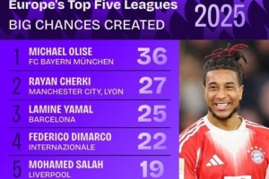 2025创造重大机会榜:奥利塞领跑,谢尔基、亚马尔、迪马尔科前四