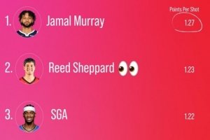体育资讯12月22日讯 数据专家Kirk Goldsberry晒出了本赛季至今平均每次跳投得分最多的球员榜单,具体如下: