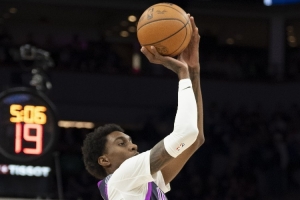 森林狼球员麦克丹尼尔斯上半场手感相当火热,开场不久就上演空接暴扣,随后更是三分三连击帮助球队将比分拉开。