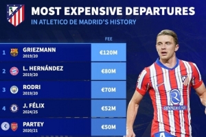 体育资讯1月15日讯 马竞已经官宣中场加拉格尔转会热刺,《转会市场》也统计了马竞队史最贵卖人情况,格列兹曼仍居首。
