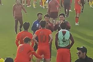 中国U23国足0-0泰国U23,实现U23亚洲杯历史首次出线。赛后王钰栋拍合影,拜合拉木趁机扒裤子,王钰栋回头看错方向。