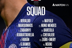 巴黎对阵里尔名单:登贝莱、杜埃、K77在列,若昂·内维斯缺席