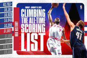 体育资讯01月19日讯 火箭今日主场119-110轻取鹈鹕。赛前,杜兰特距离NBA历史得分榜第六的诺维茨基仅差16分。