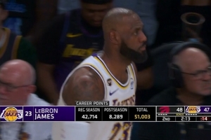 据统计,詹姆斯职业生涯总得分(常规赛+季后赛)突破51000分大关,继续创造历史纪录。
