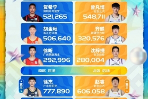 2026CBA全明星赛第二周票数公布,徐杰稳坐票王宝座,他领先赵睿的优势扩大到17万张。南区后场庞峥麟被胡明轩反超,北区前场周琦被沈梓捷反超。