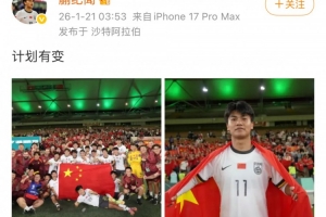 赛后为U23国足首发出战的蒯纪闻更新社媒,晒出赛后全队合影以及自己身披国旗的照片,并配文写道:“计划有变”。