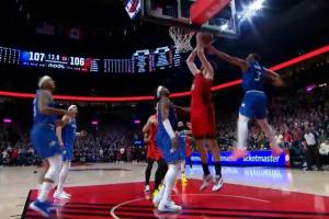 106-107的开拓者落后1分,篮下克林根接球有绝杀机会的扣篮,被身后贝恩按下了!