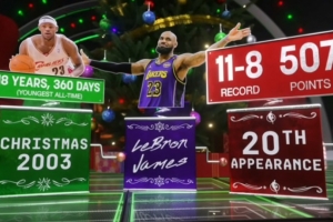 据统计,这将是詹姆斯生涯第20次在圣诞大战中亮相,此前他圣诞大战的战绩为11胜8负,共砍下507分(圣诞大战历史纪录)。